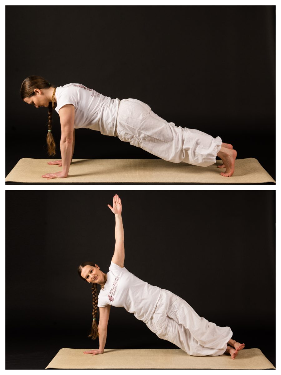 - Belégzéssel a jobb kezed emeld el a talajról, nyújtózz vele felfelé. Fordulj bal oldalra úgy, hogy a bal tenyér és (a lábujjak helyett) a bal külső talpél a talajra támaszkodik. Nyújtsd és zárd össze a lábad a belső talpéleket egymáson tartva. Könnyítésképpen a két lábfej lehet egymás előtt is.